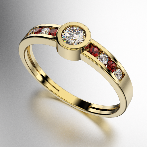 ANILLO PIEDRA CENTRAL REDONDA ENGARCE VIROLA (3.25MM) COSTADOS MEDIO SIN FIN CON PIEDRAS REDONDAS (1.75MM) CUBIC-RUBI ORO AMARILLO 18KTS (MOD. A013) Cuotas - Sin Interés: