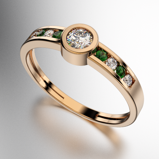 ANILLO PIEDRA CENTRAL REDONDA ENGARCE VIROLA (3.25MM) COSTADOS MEDIO SIN FIN CON PIEDRAS REDONDAS (1.75MM) CUBIC-ESMERALDA ORO ROJO 18KTS (MOD. A013) Cuotas - Sin Interés:
