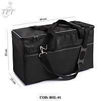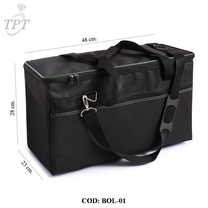 BOLSO MAYORISTA (48 X 28 X 23 CM) MATERIAL: CORDURA IMPORTADA DE ALTA RESISTENCIA, FORRADO EN SU INTERIOR. BOLSILLO EXTERNO. HERRAJES METÁLICOS. 5 REGATONES DE APOYO. ASAS Y BANDOLERA DE COLGAR.