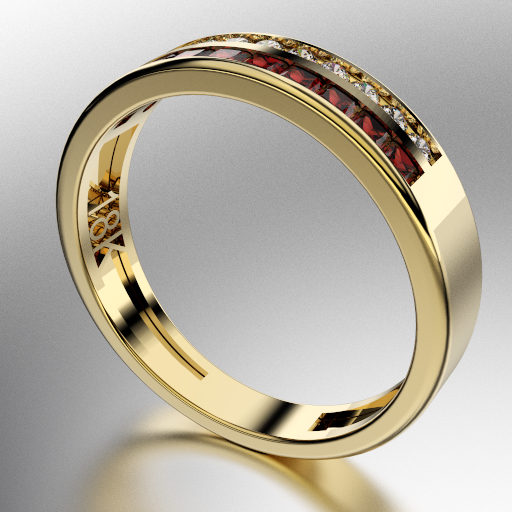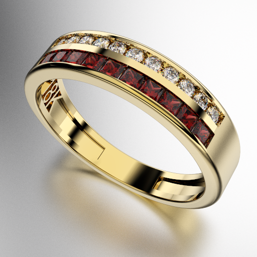 ANILLO DOBLE MEDIO SIN FIN UNA HILERA CON PIEDRAS CARRE (2MM) Y OTRA CON PIEDRAS REDONDAS (1.5MM) CUBIC-RUBI ORO AMARILLO 18KTS (MOD. A044) Cuotas - Sin Interés: